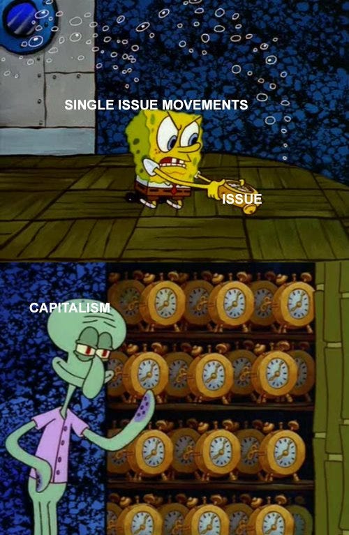 Liberals will try to do this inevitably and will do so without critiquing capitalism, any rigorous understanding of the system would reveal the apocalyptic futility of such efforts. Such a movement would also allow us to rearrange the debate and the alliances we have, it would force liberal organizations and politicians to either follow us or reveal their desire to preserve some form of economic authoritarianism. A fight that is simply antifascist, or single issue, would either force us to play on the game board that the right is creating for us, or force us perpetually in coalitions in which we follow instead of lead. And if we follow liberals for the next few years, we will likely be led into the abyss.